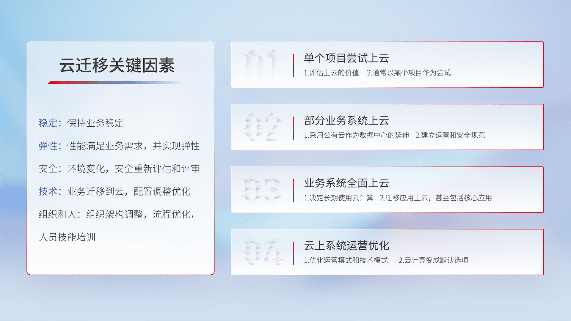 结合实际业务,,从规划设计、、、云平台选型、、、云原生改造、、数据迁移、、、集成交付,,,,迁移全过程为客户识别最佳上云路径,,,做好风险识别管理,,设计网络架构、、、身份权限、、安全审计合规、、、操作审计、、、、日志审计、、监控告警策略、、多站点容灾设计等,,,,对云上基础设施进行整体规划,,提升IT治理水平,,,,以满足弹性、、、、高可用、、、高性能的需求。。
