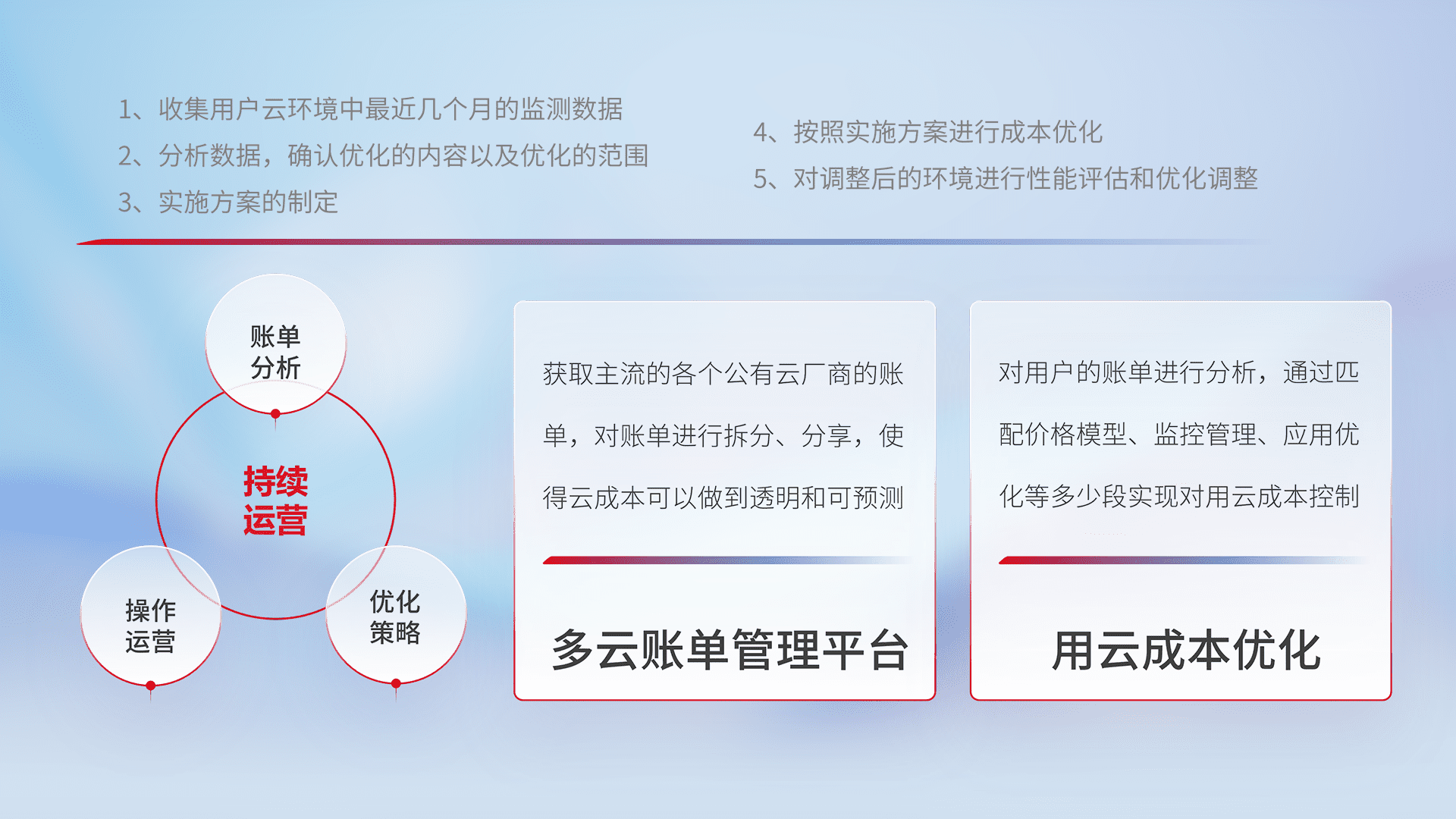 通过多云纳管,,,以统一的资源数据模型把客户的云资源进行抽象和封装,,,进而实现对多云资源的统一操作,,,,保障云资源管理的可靠性、、稳定性与可用性。。量身定制化运维内容,,配置、、开发运维、、补丁管理、、备份、、、监控、、认证和访问管理、、、、审计和日常巡检等,,,,保障在用云过程中的可靠度,,稳定度以及高可用率。。。